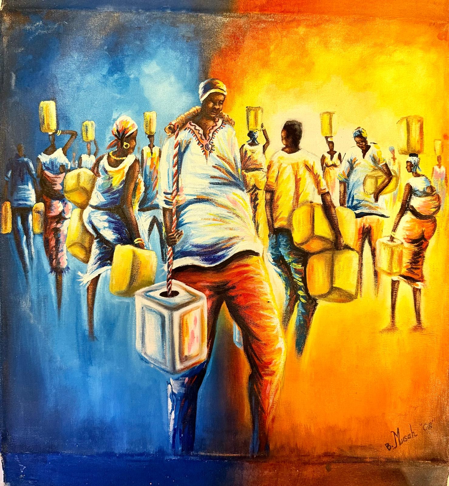 Musah Swallah, artista ghanese residente a Brooklyn, New York. Dipinge su legno, carta, tela e tappi di sughero.